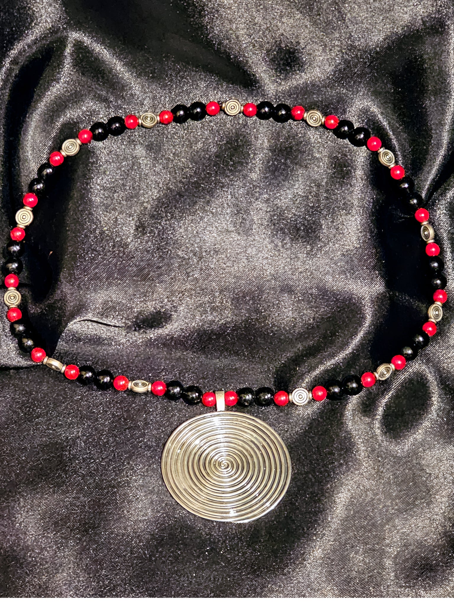 This necklace is made with Black Tourmaline, an EMF blocker, and dyed Howlite. There is an antique style large labyrinth pendant attached.